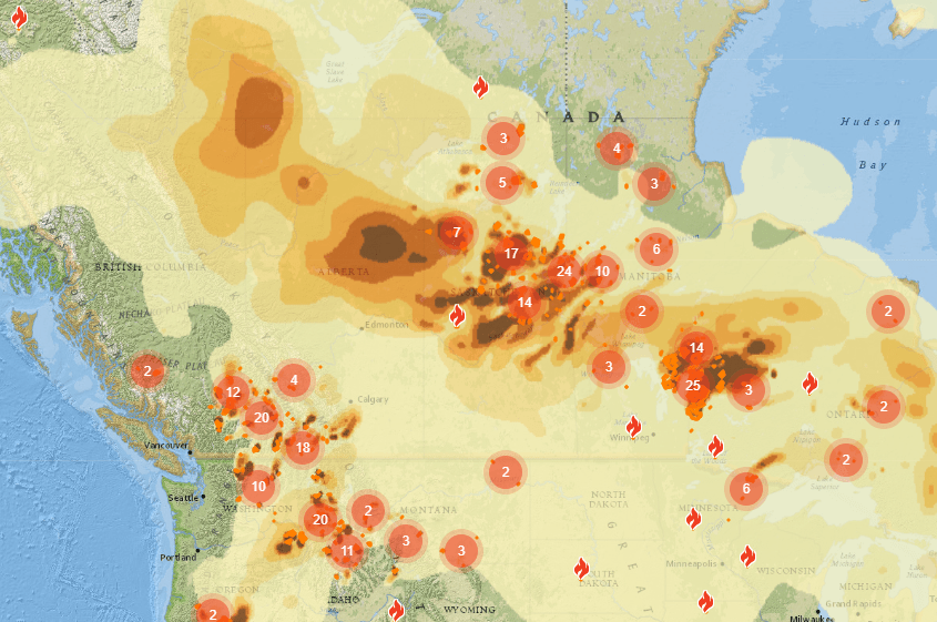 One of my colleagues started his career as a forest fire fighter, spending years of summers helping to control burns and protect small communities surrounded by kindling. We had an amazing conversation on Friday as he talked about his knowledge of the history and strategy of forests in Canada and the different approaches taken by different regions of the country, all of which go a long way to explaining why and where those little orange dots appear on the map above.
