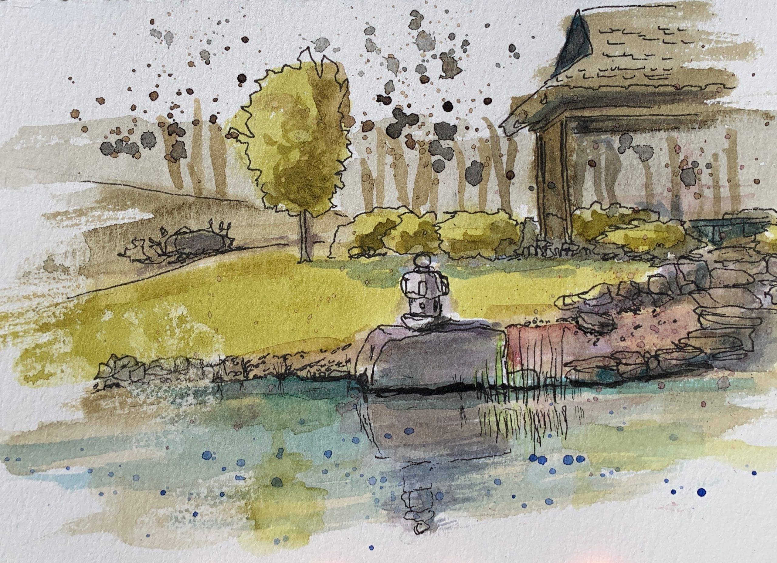 One of the gardens is a Japanese-style garden, built in consultation with cultural representatives, and stuffed with little (faux?) temples, bonsai-style trees, fish ponds and stepped stones. I planted myself on the shore of the pond a little after lunchtime and painted a scene.