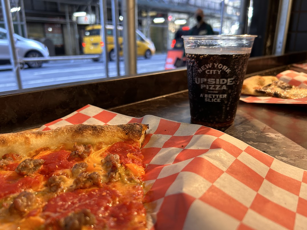 Sitting in a little shop a couple blocks from the 5th Avenue branch of the Public Library, I don’t know if we found the best pizza in NYC, but we certainly found a great example of it. Three burly guys-guys behind the counter asked us to pick our slice and then they heated it up in a big slot of an oven before serving it on a paper disc and a checkerboard sheet of parchment. We folded it in half and bit into it and sat facing out onto the sidewalk where folks strolled by.