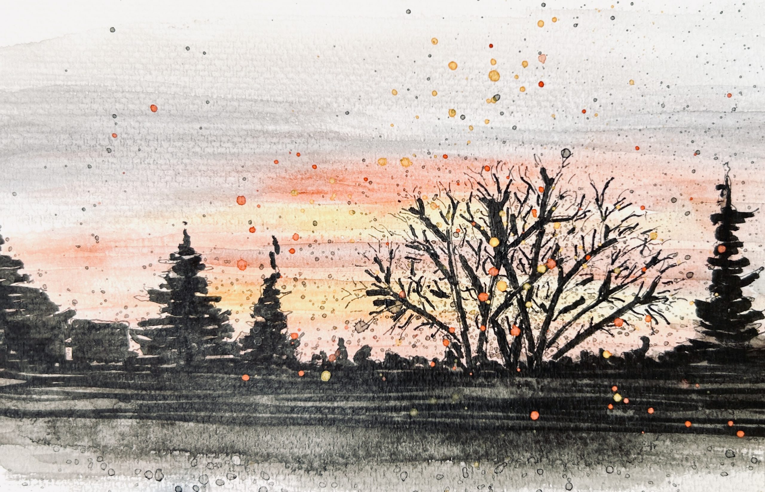 I started with a wet-on-wet technique, laying down some generously moist yellow lines just above where I supposed my horizon to be. After about ten minutes of letting that seep softly into the page, more wet-on-wet with some alternating reddy-orange streaks, all of it just trying to touch but with enough room for each colour to hold it’s own on the page. As that started to dry and set, I tried to find an optimal time to fill in the space around it with a very diluted deep blue, and added slowly compounding layers to the rest of the sky and slowly, carefully and deliberately pulling the grey-blue tones into the red and yellow spaces.