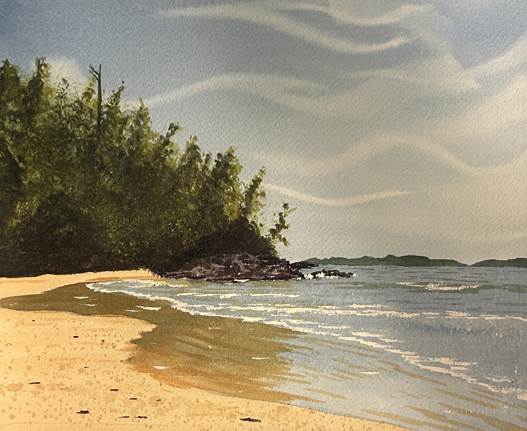 Coincidentally then, maybe, in tackling a west coast beach scene in last night’s class I — three days late — came across the solution to my wandering through the wilderness alone attempt at water and wet sandy mud.
