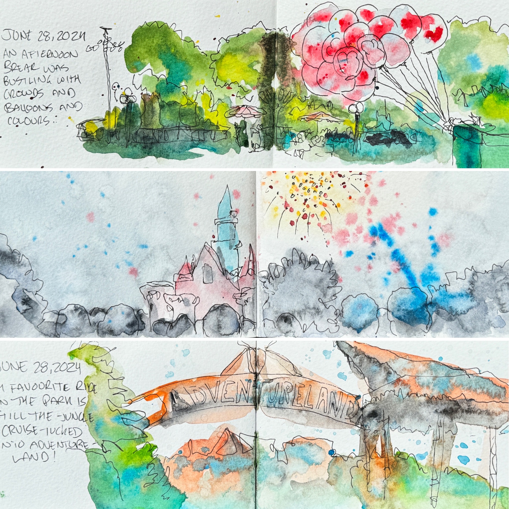 Well, I snapped a pic, too, and did all my painting back at the hotel. I wasn’t exactly going to hold a sketchbook open on a rollercoaster while I waited for my washes to dry.