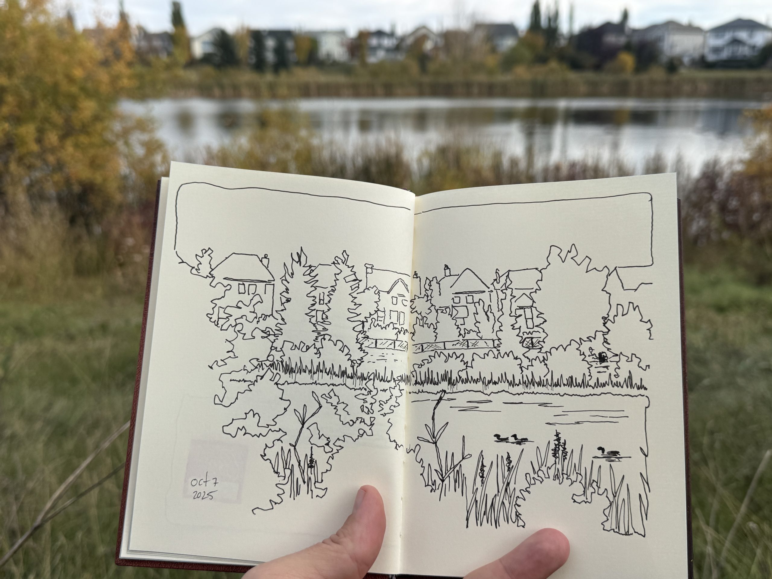 All that aside, what my goal for the last nine days has been is embracing the clutter and chaos of a scene. Urban sketching (and thus I will postulate, suburban sketching) is very much about a Venn-like diagram of purpose and positioning (artistically speaking) in a way that overlaps with snapshot vacation photography. That is to say, if I were to walk out into a busy city street, stroll into a lovely urban park, or sit on a bench beside a cute little corner shop, I may be so inclined to snap a photo, right? But with a sketchbook in hand, and a pen at the ready, I should be able to stay a little longer and draw the view instead.