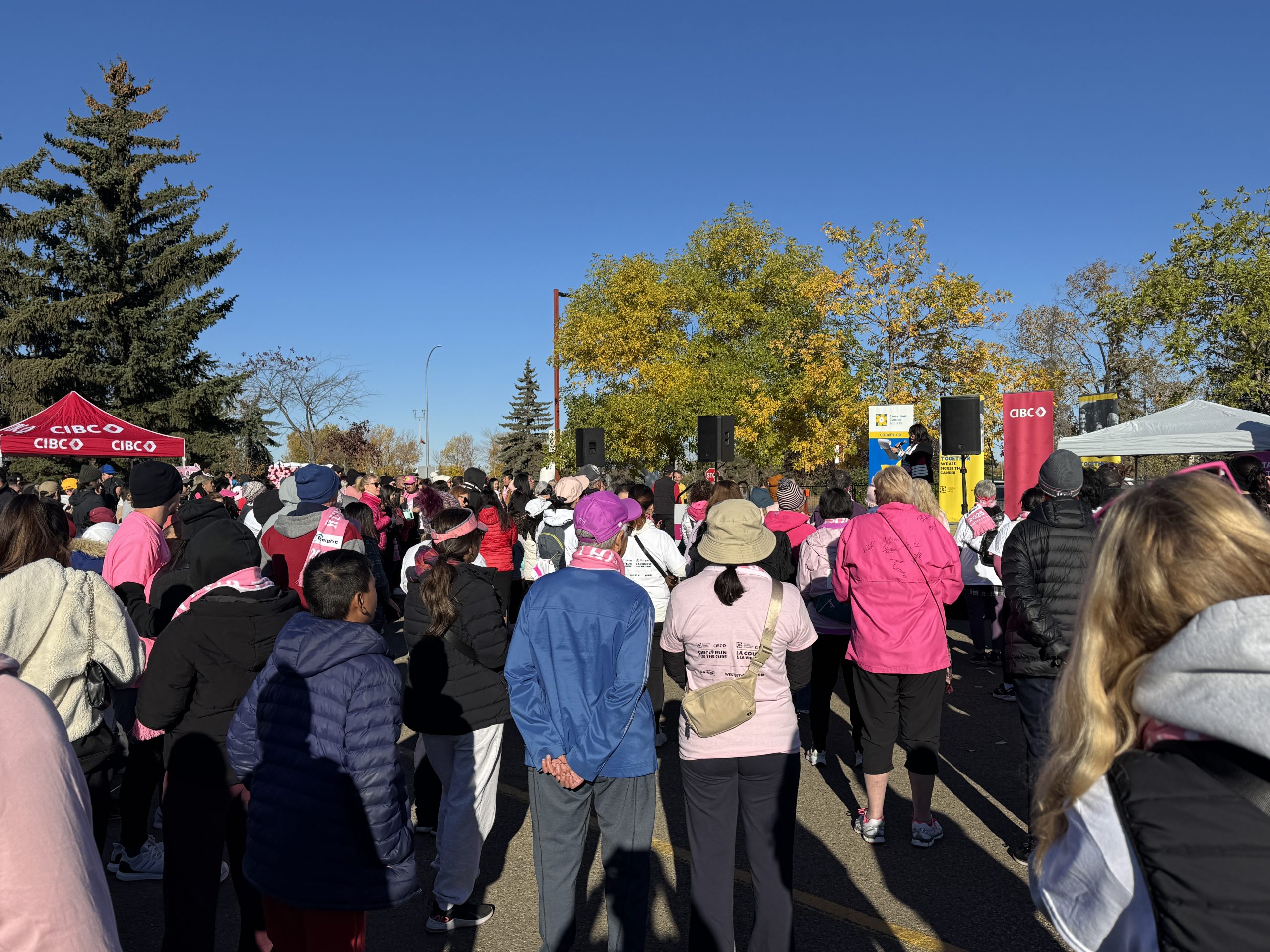 Sunday was a crazy run day. I met a few of the crew in a weird neighbourhood in Mill Woods for our ten klick pre-run. We ran a bunch of trails with which I was formerly unfamiliar, all of which ended us at the Towne Centre parking lot. Then we stood around in a crowd of about six thousand people waiting to run the Run for the Cure 5k breast cancer run. SL is a manager for CIBC bank, the title sponsor, so she rallied us onto her team and we wore colours and rounded our our ten klick pre-run with a crowded five klick fun run to make our training distance fit. Then we went for pho.